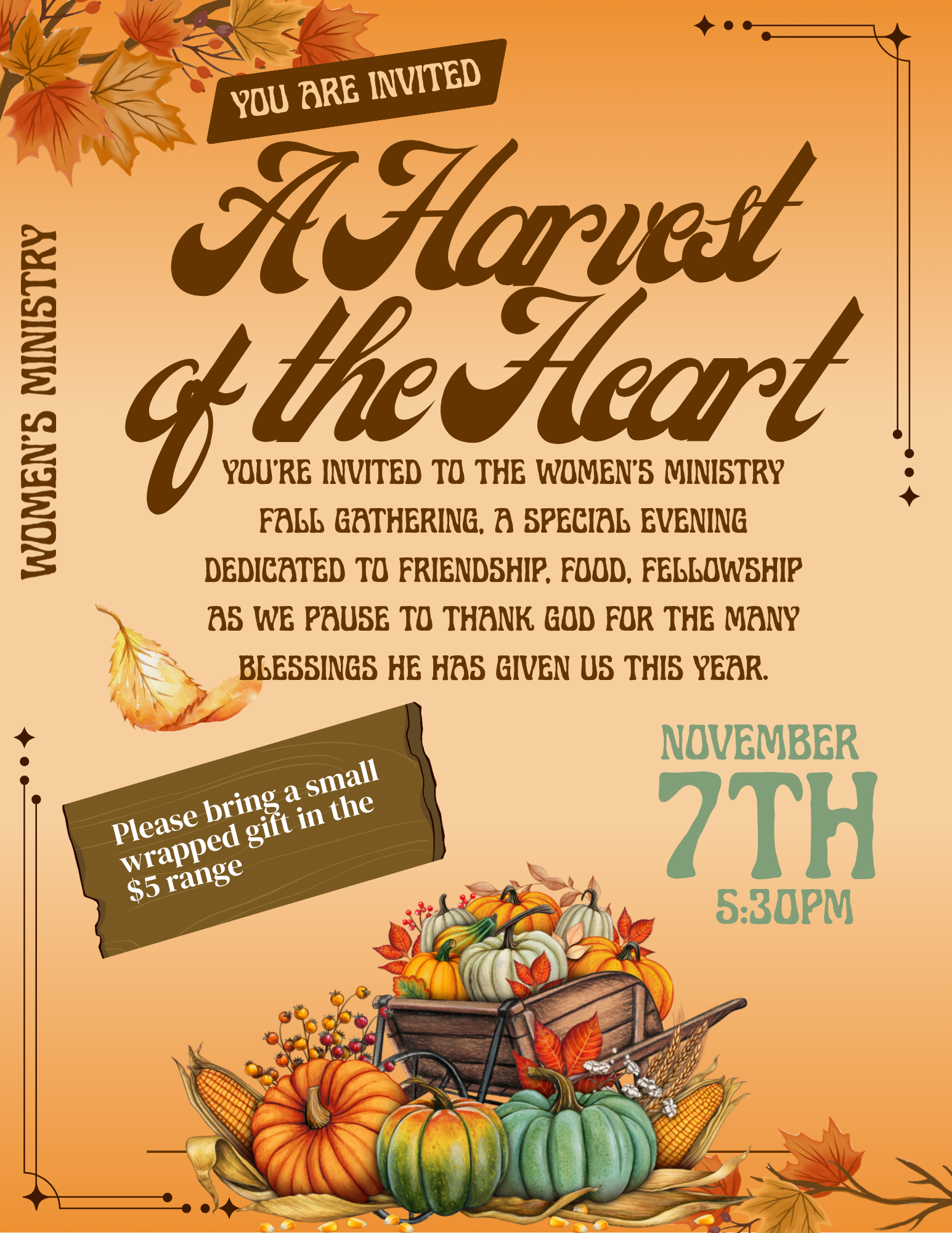 You’re invited to the Women’s ministry fall gathering, a special evening dedicated to friendship, food, fellowship as we pause to thank god for the many